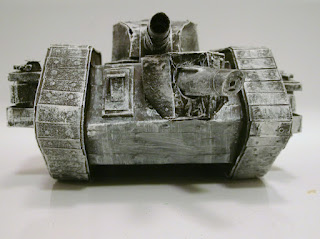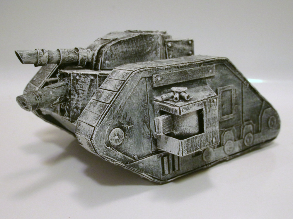The cardboard tank nears completion. Side sponsons, black paint, white drybrush, this beast is ready for its final paintjob. In keeping with the theme of the Imperial Guard unit, it’s going to get a green and purple camouflage paint scheme. Wouldn’t be my first choice, but it’s a commission for my favorite client.