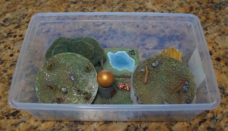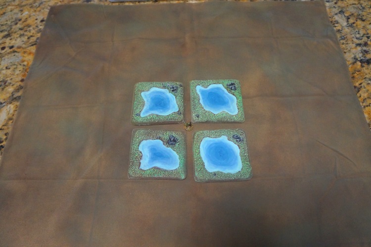 I also threw together four ponds. They are just MDF with sand glued for land and blue paint for water. The water got a couple of coats of glossy clear-coat to give them a little shine.