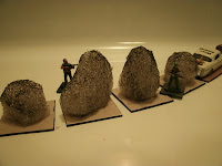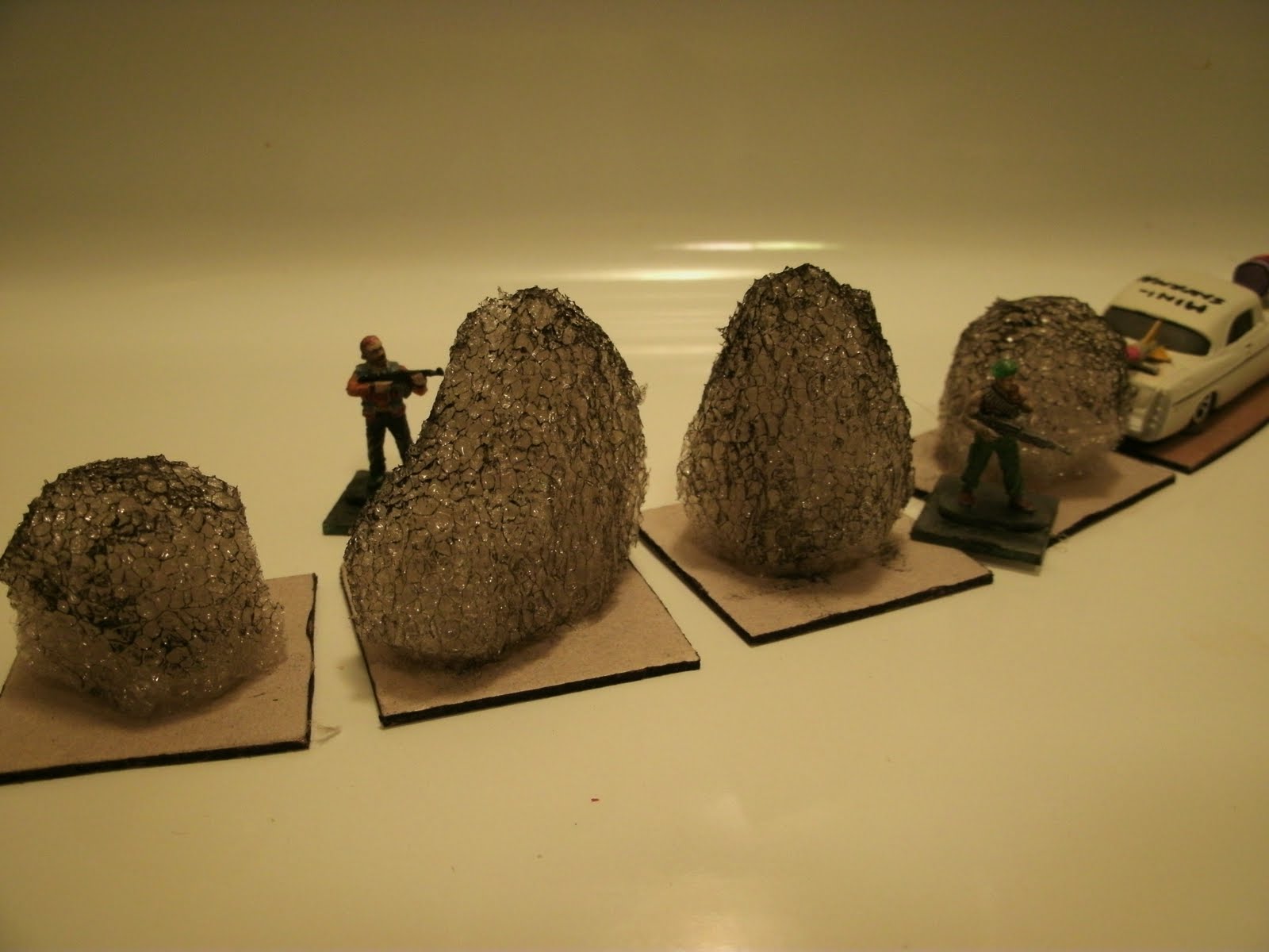 These are scraps of soft, but stiff, packing foam used to cushion computer accessories. I simply shaved them into the desired shape, hot glued them onto the appropriately sized counters, and then drybrushed the tops with black paint. My little cotton ball experiment failed in that cotton balls are too soft and fibrous – they start to peel away from the base before you even get them on the table. These puffy nuisances hold their shape much better than cotton, and they don’t blow around in gentle breezes.