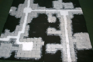 Work progresses on the sewers.  Black spray paint, white drybrush on the tiles, and one tile grayed up a bit.  The color gradations on this terrain are subtle; they are the details that you only don’t notice when they aren’t there.  Here’s a comparison of the white (left) with gray applied (right):