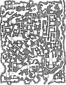 Specifically, the following wonderful full page map from Dyson’s Dodecahedron. (He has lots of other pretty little things, you should visit his blog, too.) Look at that thing, sprawling, interconnected, lots of fun little nooks and crannies, and enough chokepoints to carve it up into a bunch of separate mini-dungeons. Three times I’ve tried to fill it up and failed, but now I think I’ve finally figured out how to do it right.