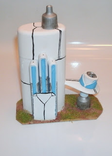 A couple of days ago you saw some junk being spun into Tau terrain in the hopes that the Tau terrain could be spun into gold – or at least some Imperial Guardsmen. Here are the buildings with paint.