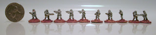 The guys in front are Pendraken SF1. Near as I can figure the only real difference is that the guys in FL2 have full face covering screens. Otherwise they are all lightly armored infantry in near-future battledress.