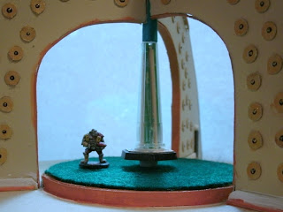 Tell me this bridge doesn’t evoke a TARDIS feeling. That’s a basic hex base for a 28mm figure with cereal packet painted with dials, screens, and other controls. I took the same style syringe cap used for the engines and stuffed it full of green and unpainted toothpicks. The whole mess fit perfectly wit the bamboo skewer coming down from the nose of the ship. Green felt serves as carpet and completes the upper bridge.