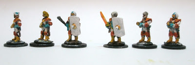 Every figure here is based on the Law Officers range, with heads donated from various other lines. The third guy and fifth guy from the left are unconverted. The head on the far right is taken from a fantasy archer figure, and the alien head is from the HOF line of figures.