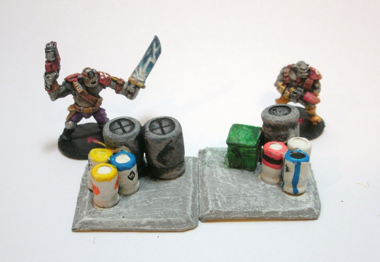 Nothing too novel here. Those are all electronic doo-hickeys ripped out of an old and irritating childrens’ electronic piano. They are glued to a base for added weight and stability, then painted up largely as is. The one little box there breaks up the monotony a bit. White barrels with colored logos helps brighten up the table and keep it at least moderately pulpy.