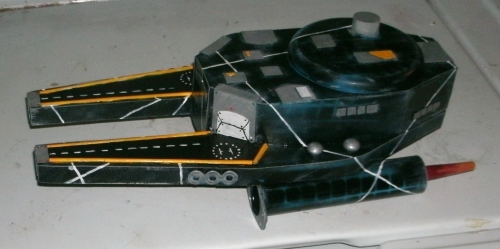 Can’t remember if the unpainted version of this ship was ever posted or not. Either way, here is the last and the biggest of the human ships for Big Thrust – the mighty fleet carrier. Down the road we’ll assemble some fighter groups for it, but that won’t take long. Again, this is mainly foam core and cereal box cardboard.