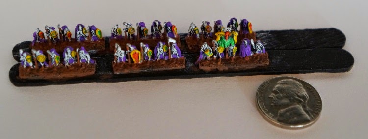 Got the first couple of strips of 6mm skellies painted for the boy’s medieval force. He asked for a main color of purple, but wasn’t sure what secondary color would work best. This is a bit of a test strip to see if a second primary color is even necessary. Throwing a lot of flashes of colors into the mix might be all that’s necessary.