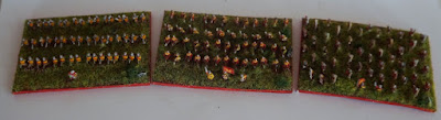 One of the little challenges for old men like me who game with little men like these 6mm Heroics and Ros figures is finding a way to make it obvious from a distance which little horde is which. One of my helpful solutions is to base the individual figures in easily recognizable patterns. They may not be historically accurate, but sometimes history takes a back seat to playability.