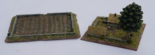 For my Big Box of One Hour wargames, I have elected to represent towns as a farm stand. Not the kind you pass on the road in the country, but a wargame stand featuring a farm. The field on the right is simple balsa wood walls and painted sand. The walls are big enough that a full stand of troops can fit inside them. The row of crops is early in the season and consists of glued and painted sand that should hold up well with repeated wear and tear.