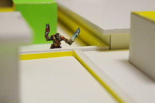 The buildings themselves are basic terrain pieces, just foamcore held together with craft glue and scotch tape. For variety, the buildings are built to three different heights, and the cornice* of each building has a different height. This breaks up the terrain and serves as additional cover at the cost of no additional space. As you can see, all four buildings still need a lot of detail.