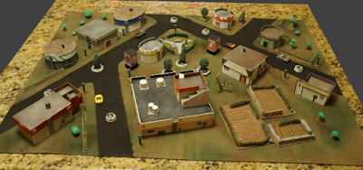Four trees, actually. Nine more pieces of scatter terrain – what the cool kids are calling street furniture these day – have been added to the table for cover.