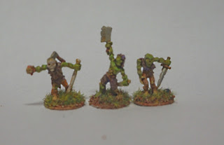 The death cult pack of figures from Rap Partha Europe also includes these three zombie looking fellows. Since the cult in Castle Meatgrinder is dedicated to the dungeongod and not necessarily to any sort of necromancy, it made more sense to me to throw these into the tomb with the above.