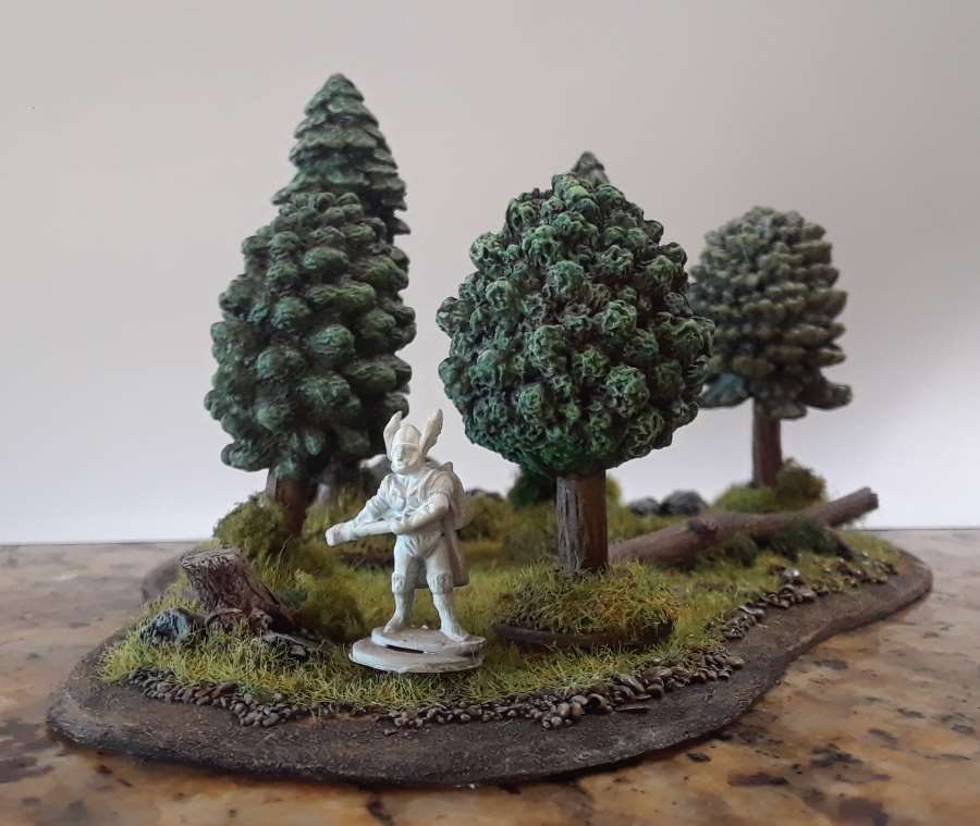 The pine tree nearest the camera here has a larger base constructed of a pre-cut wooden disc.  These were used in a few cases to allow for the addition of a few rocks and logs to add to the variety of the trees.  This is my go-to system that allows for dense wood terrain pieces where you can move the trees around to allow unlimited movement of figures within the base, and adds the flexibility of using the trees individually as well.
