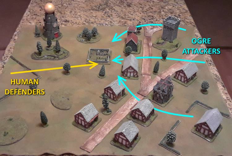 The ogre made the tactical blunder of sending his troops in piecemeal instead of waiting and slowly marshalling his forces. His vanguard was meant to slow down the humans, but just wound up getting destroyed by a combination of flanking fire followed by a hammerblow of melee.