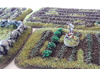 It’s late autumn, just after the crops are in and the table fully dressed. The crops are just MDF covered in sand. Took two or three applications to get those furrows looking right, but it paid off. They demarcate rough ground, but don’t hamper figure movement in the least.