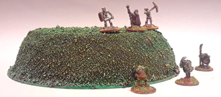 Generally, I prefer to make my hills gentle so that figures can stand anywhere on them. This style of hill provides a binary on-off that suits the needs of the project. Remember that the goal is a cheap 4-piece setup that will still look good on camera. By forcing the players to declare “this figure is on the hill”, this system should prevent any confusion when playing long-distance games via computer camera.