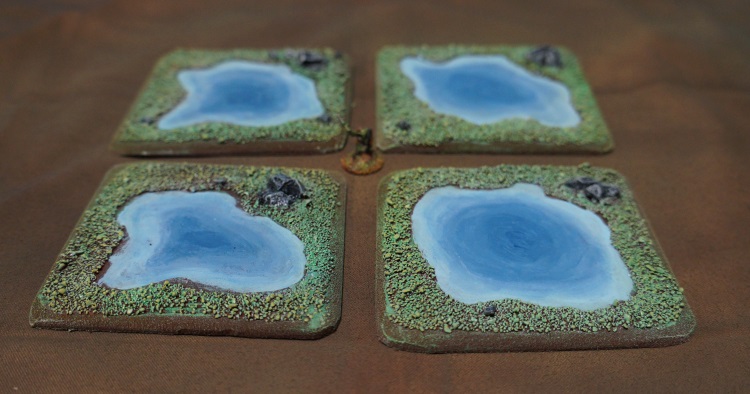 I also threw together four ponds. They are just MDF with sand glued for land and blue paint for water. The water got a couple of coats of glossy clear-coat to give them a little shine.