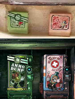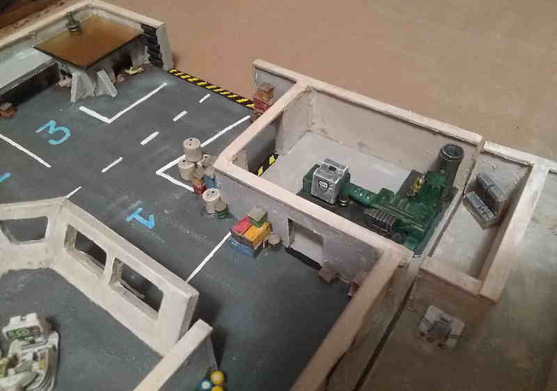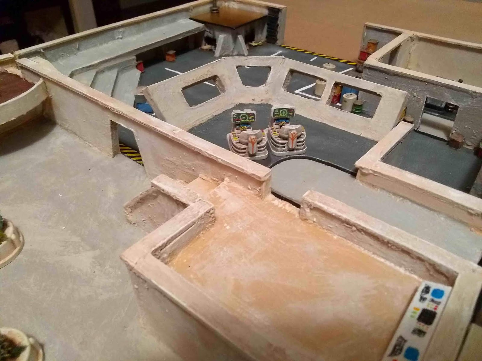 For those of you who prefer still life to video life, here’s a shot of La Tortugastra, still a work in progress. I’ve got a few more terrain items to slap down, and the walls are looking pretty bare to this day. Needs more travel posters, artwork, graffitti, and utility boxes. Still, it’s shaping up nicely, and once I finish playing through the Necromancer King’s Crusade, I’ll get cracking on some sci-fi shoot-’em-ups here in the biggest little spacestation of all.