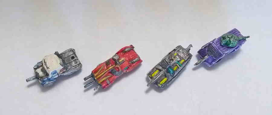 Picked up a batch of the “Mad Ron” road warrior vehicles from Irregular Miniatures on a whim. Just look at these tiny little knights of the road:
