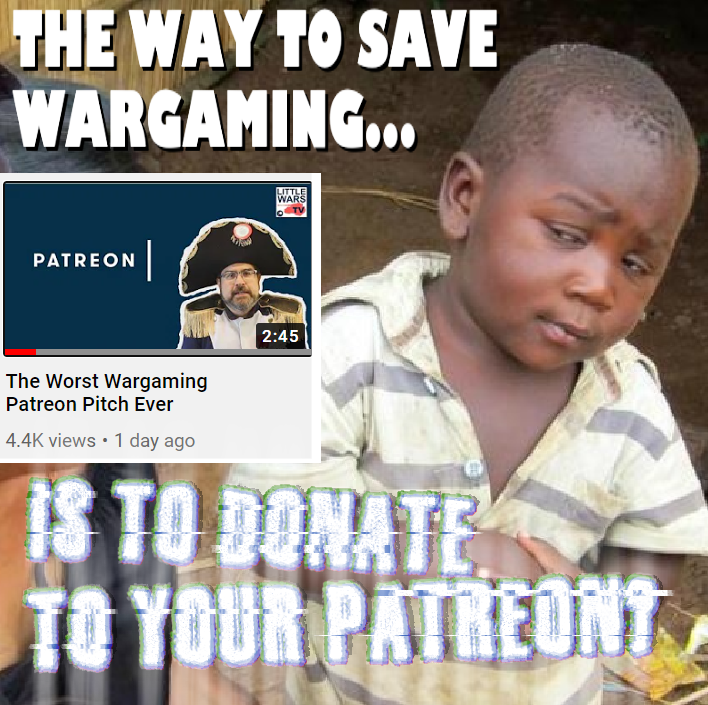 By all means, donate away.  When they are talking about wargames on the table and a little light history, they’ve got the best thing running on the Y’allTubes.  Well worth tossing a couple bones at them to keep their spirits up.
