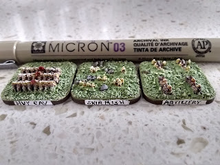 For example, my Totally Not French army comes with very little in the way of cavalry. Very little. Which might work for a Marlburnian game, but would leave them at a distinct disadvantage in a battle set closer to the Napoleonic era. Fortunately, the 2mm soldiers are enough like each other that you can swap strips around fairly easily. Provided your rank and file blocks are the same size, they can be swapped around with impunity. This allowed me to achieve a more reasonable balance between and among the various nations. The Not-French are still a little light in the Cavalry department, and the Not-Russians have very little heavy cavalry on hand.