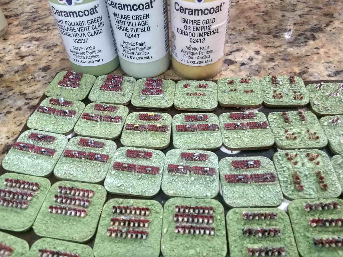 And finally comes the painting of the grass. Here you can see what each step looks like with the base color on the bottom row, a light green highlight, and then a very faint touch of mustard yellow to dull the contrast and give them a bright, summery feeling. The top row has a few boulders picked out in dark gray, if you can make them out.