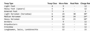 Here, Raker gives us the master troops table complete with move rates, charge distance, and in a user-friendly update, Troop Class, or TC. This number is used in both versions of the game, but Gary buries it in the morale section, where Raker brings it to the fore and even gives it a name o for easy reference. The mass is the same, the only thing that changes is the order of operations.