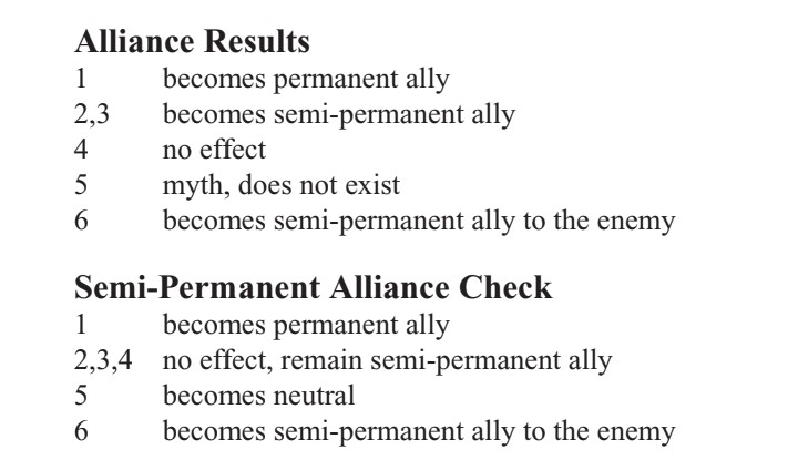 In the example above, the green and blue counters are for the neutral factions, which might ally with either side of play. The introduction of political alliances in so compact a game is fascinating. It suggests a level of replayability that punches well above its Ziploced weight. It’s also worth noting that there is a chance that these factions don’t even exist. You won’t know until you dispatch a character to sweet talk the faction and roll on the following chart. Some of the factions have multiple options as well; the Mines of Ula might house an independent demon with ogres and slaves, or the dwarf faction – only one of which can be in the game. Their power levels are about the same, but the way they handle is very different, adding a sense of mystery and uncertainty to the proceedings.