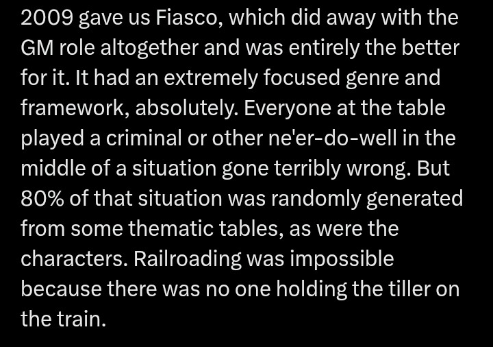 But 80% of that situation was randomly generated from some thematic tables, as were the characters. Railroading was impossible because there was no one holding the tiller on the train.