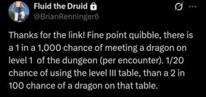 In one of last week’s posts, I summarized the statistical look pacing of AD&D as implied by The dungeons that results using Appendix A.  Fluid the Druid dug into the intricacies that result from the use of the Dungeon Encounter Matrix on page 174: